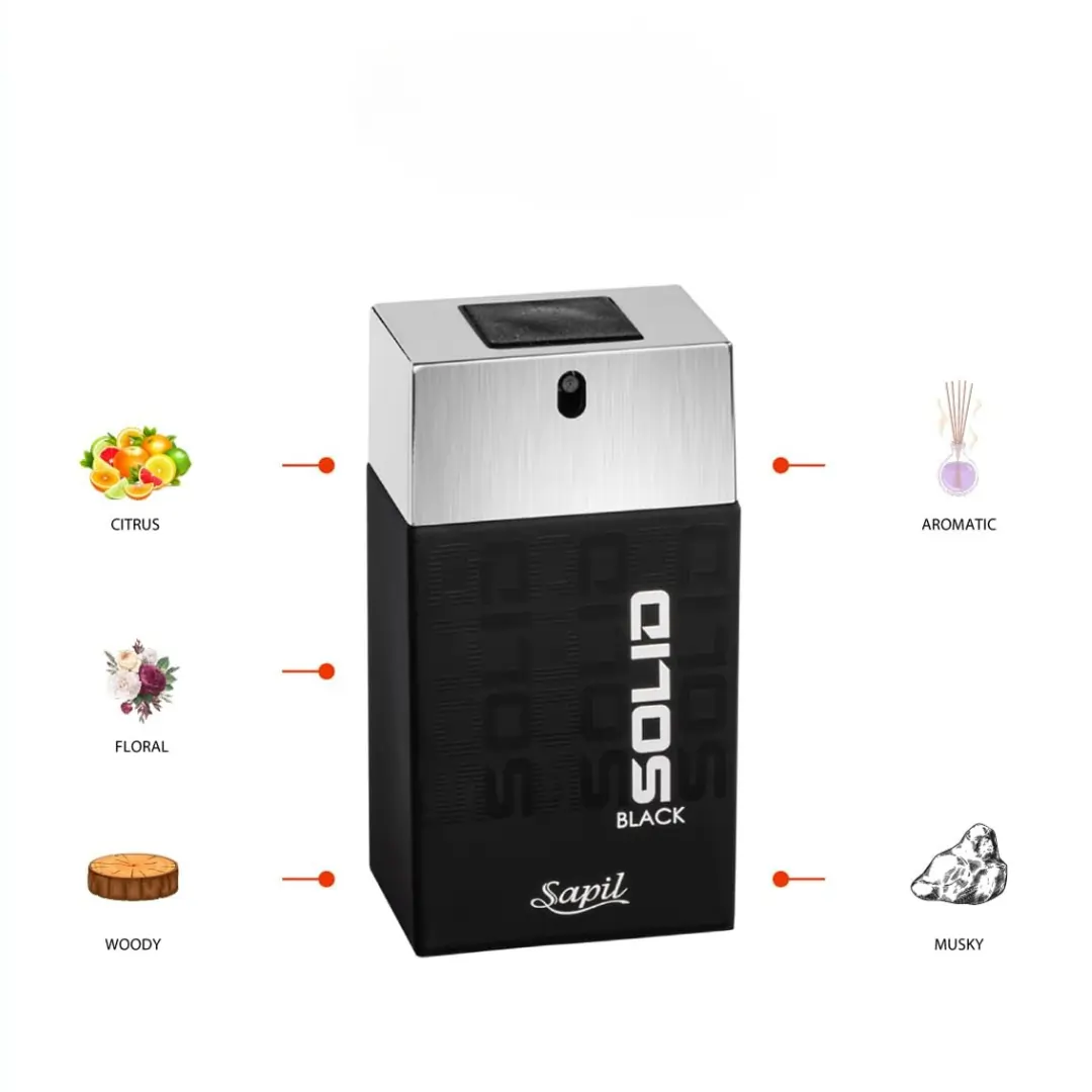 Solid Black For Men by Sapil is a men’s fragrance that opens with fresh citrus notes, transitions into a floral heart, and settles into a base of woody and musky tones. Its composition blends freshness with depth, creating a scent profile that is both aromatic and grounded in classic masculine elements.
